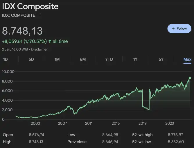 Mengutip data dari Google Finance, Indeks Harga Saham Gabungan (IHSG) mencatatkan pertumbuhan signifikan dalam satu dekade terakhir. Konsistensi dalam menabung saham (Dollar Cost Averaging) adalah kunci sukses di sini.