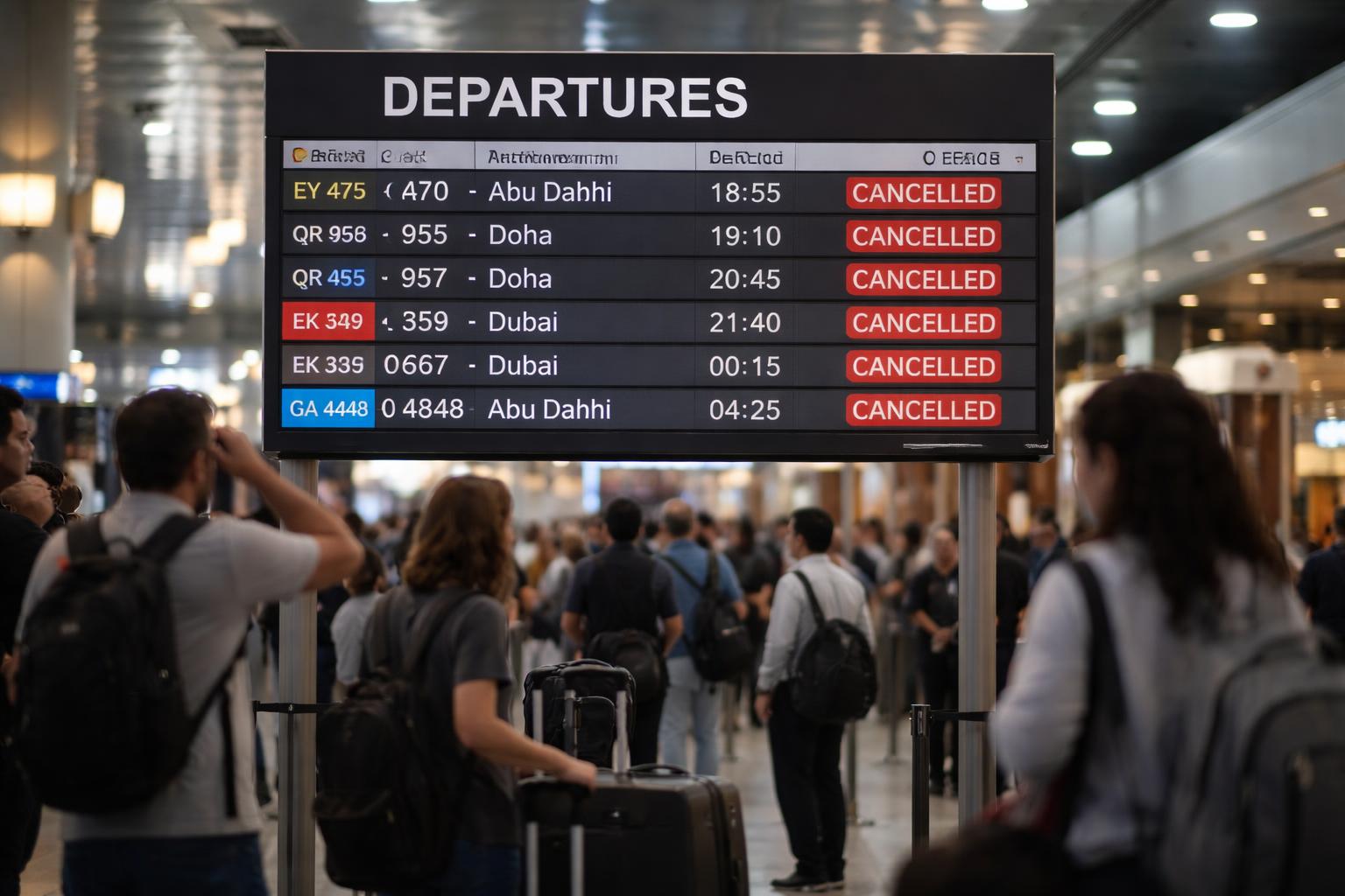 Tujuh penerbangan keberangkatan yang dibatalkan mencakup Etihad Airways EY472, EY473, dan EY475 tujuan Abu Dhabi, Qatar Airways QR954 dan QR957 tujuan Doha, Emirates EK357 tujuan Dubai, serta Garuda Indonesia GA900 tujuan Doha.